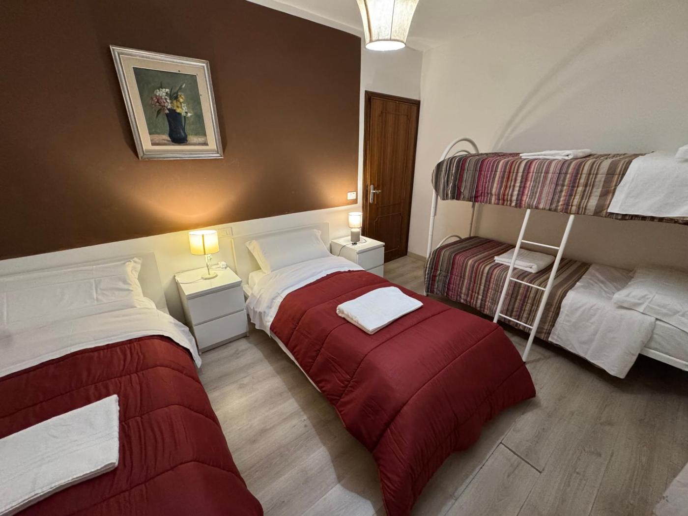 Camera Quadrupla con Bagno in Comune. The quadruple room offers air conditioning, heating, as well as a shared bathroom boasting a shower and a bidet. The unit has 4 beds. ;
